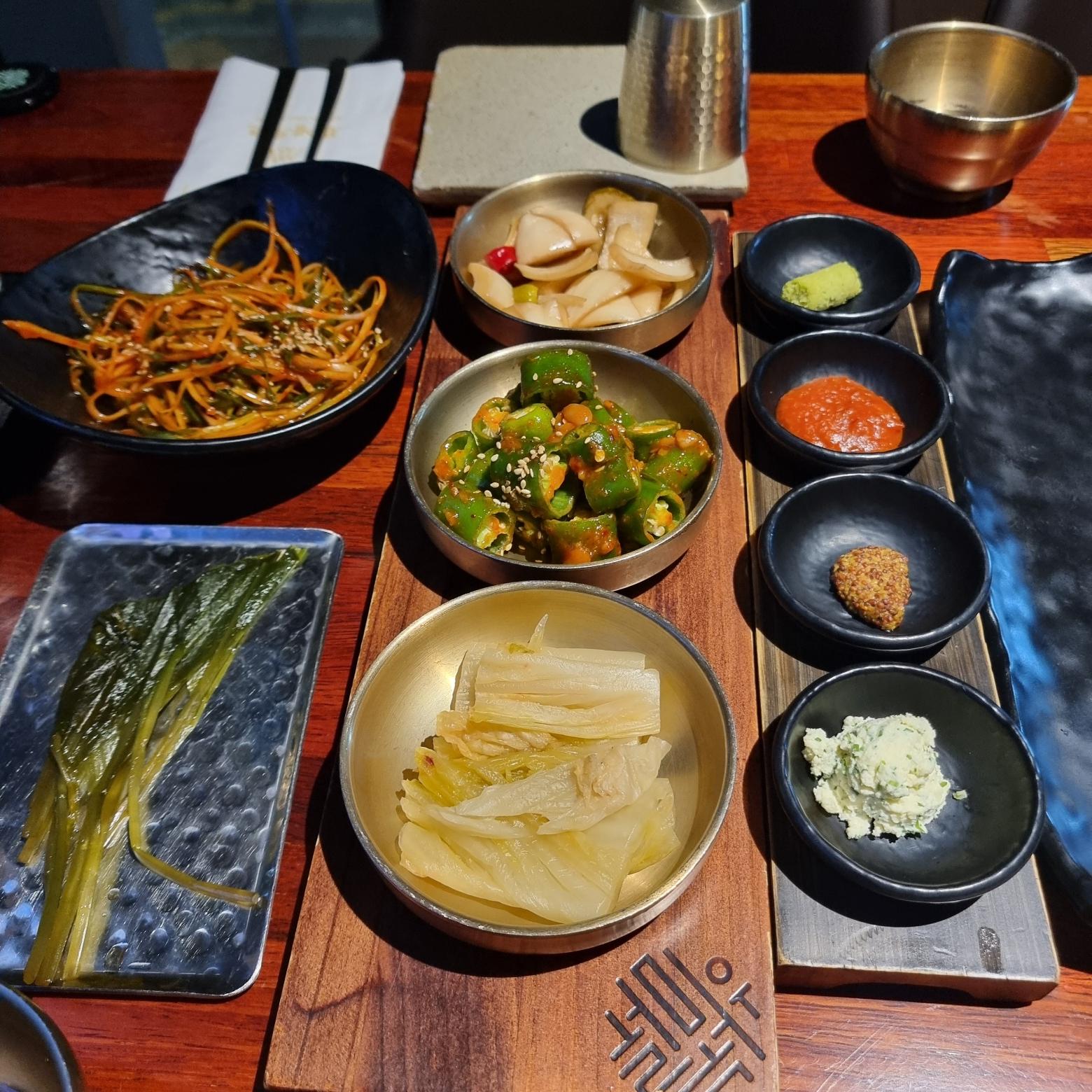 기본 찬이 정갈하게 나왔다. 백김치, 명이나물,파채,고추,양파절임에, 소스들은 레몬딜버터에 홀그레인 머스타드 소스같이 있었다.