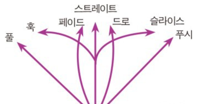 골프의 샷 궤적에 따라 이름이 여러가지가 붙어있다. 왼쪽으로 날라가는 공은 풀/ 훅/ 페이드이고 중앙으로 날라가는 공은 스트레이트 오른쪽으로 날라가는 공은 푸시/ 슬라이스/ 드로우 이렇게