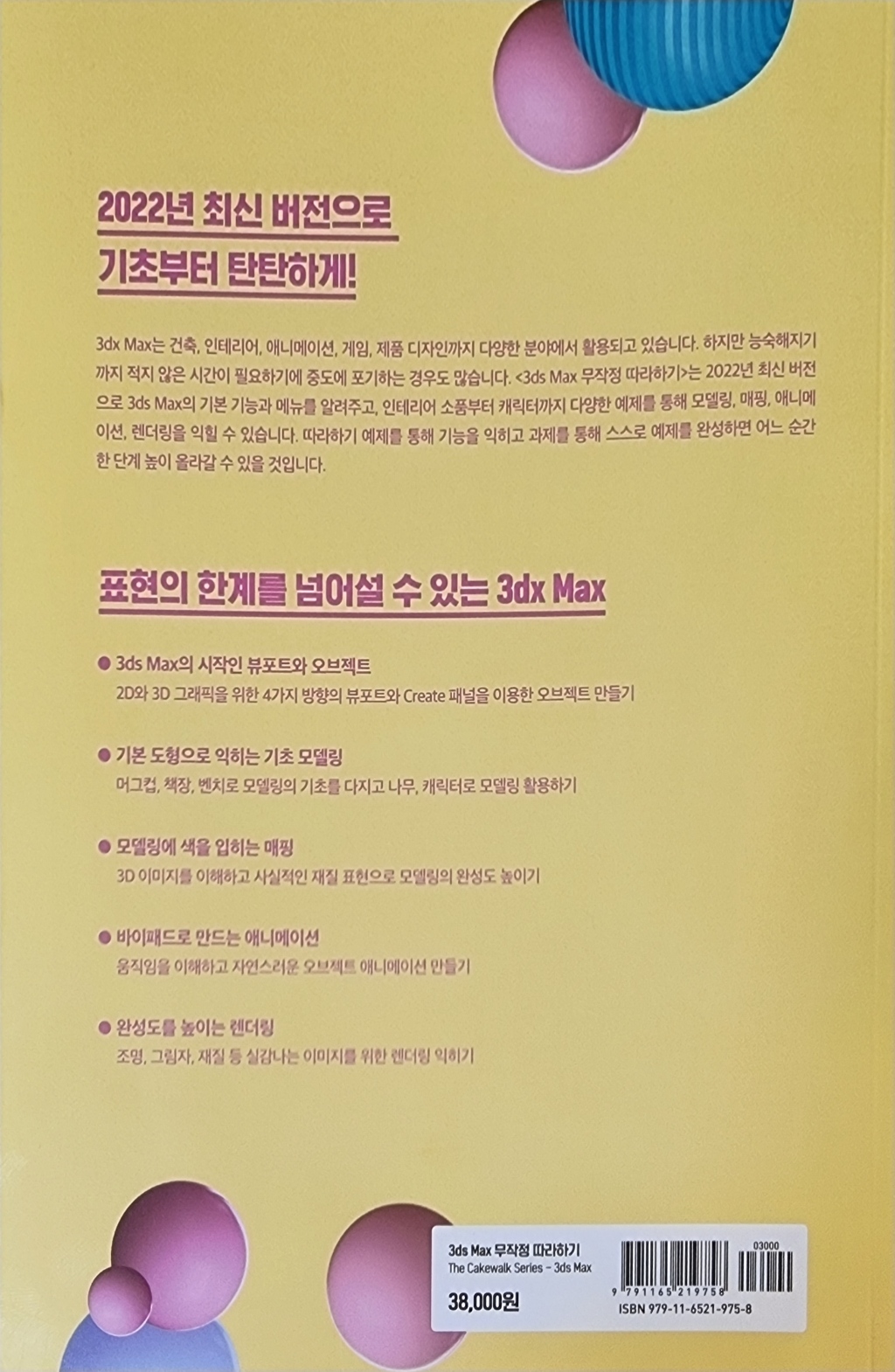 표현의 한계를 넘어설 수 있는 3ds Max2022년 최신 버전으로 기초부터 탄탄하게 배우자!3dx Max는 건축, 인테리어, 애니메이션, 게임, 제품 디자인까지 다양한 분야에서 활용되고 있다. 『3ds Max 무작