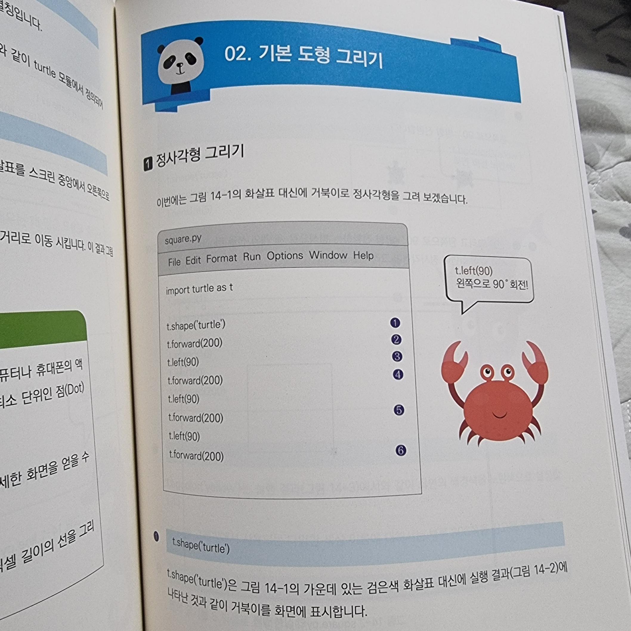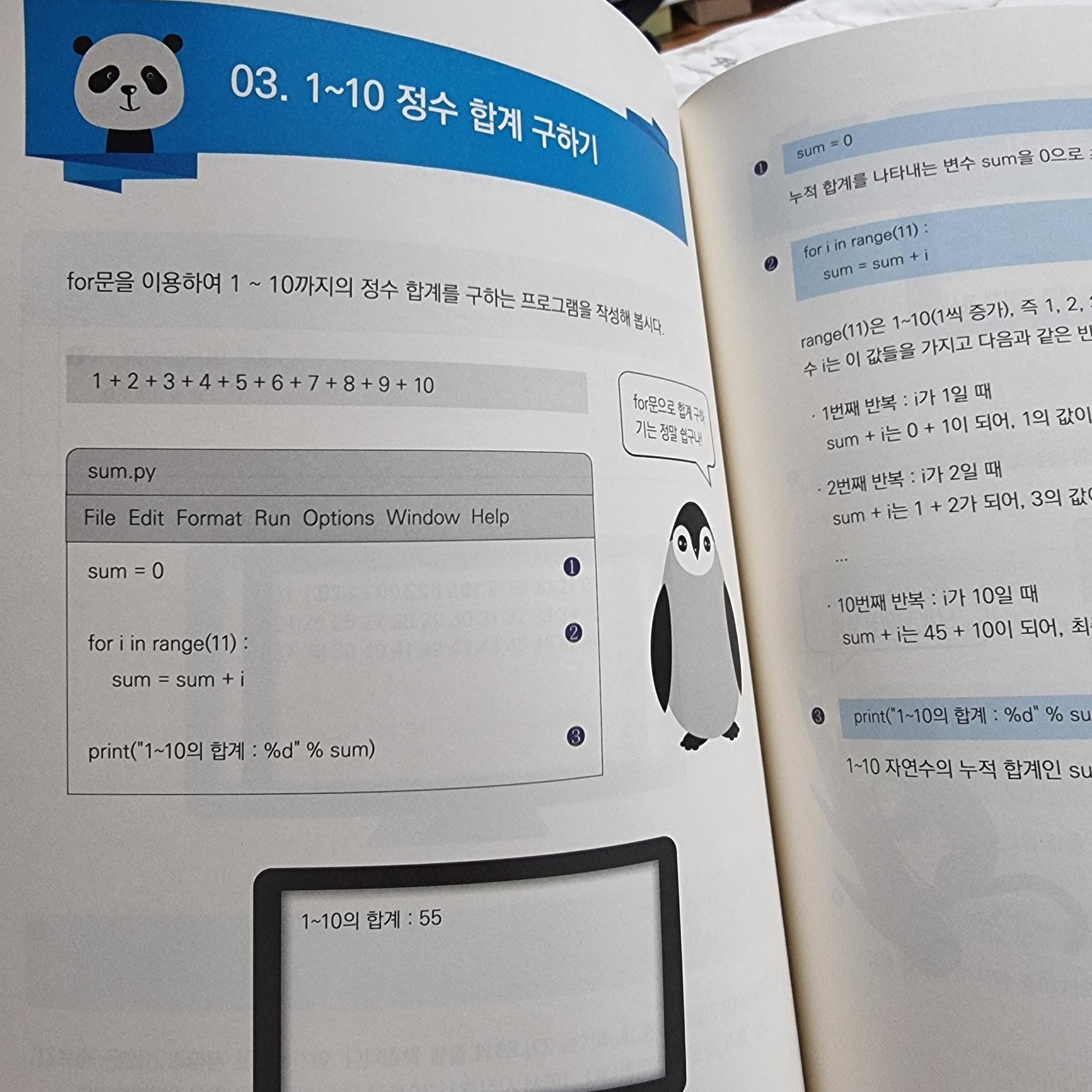 또한 팬다,팽귄등의 동물 일러스트 편집이 되게 호감스러웠고, 기본 도형 그리기, 정수 합계 등 많은 예제로 재미있게 공부할 수 있게 구성이 되어있다.