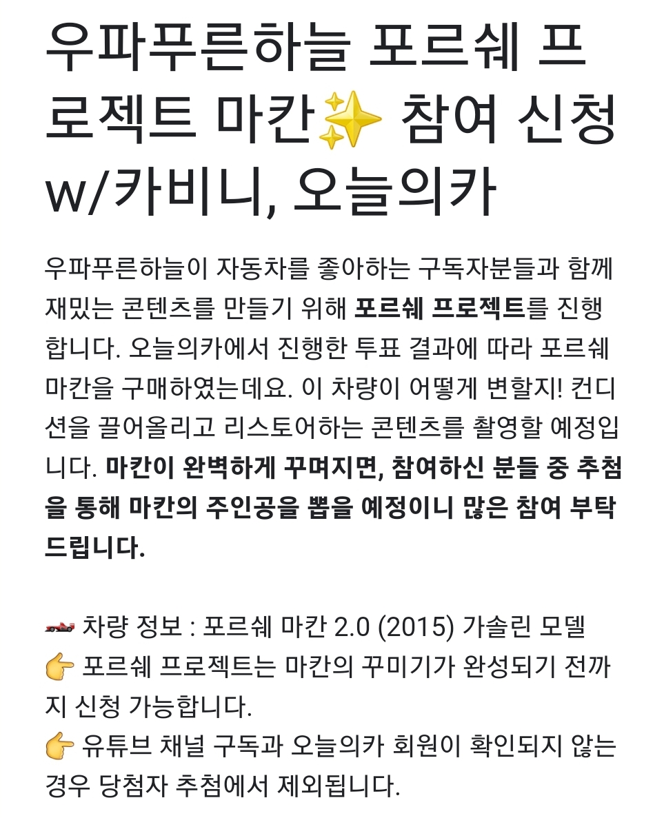 포르쉐 마칸의 주인공을 뽑는 구독자 이벤트를 우파 푸른 하늘 채널에서 진행하고 있다