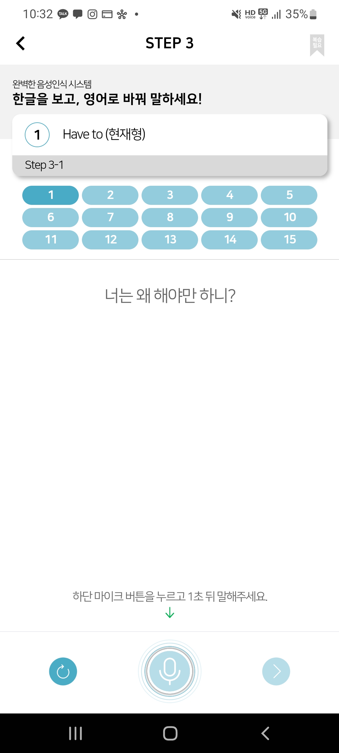 트레이닝 1 ,2 하고 영어로 바꿔서 말할 수 있게 한글을 보고 영어를 말하면 AI가 영어 정답을 판단해주는 부분이 있다.