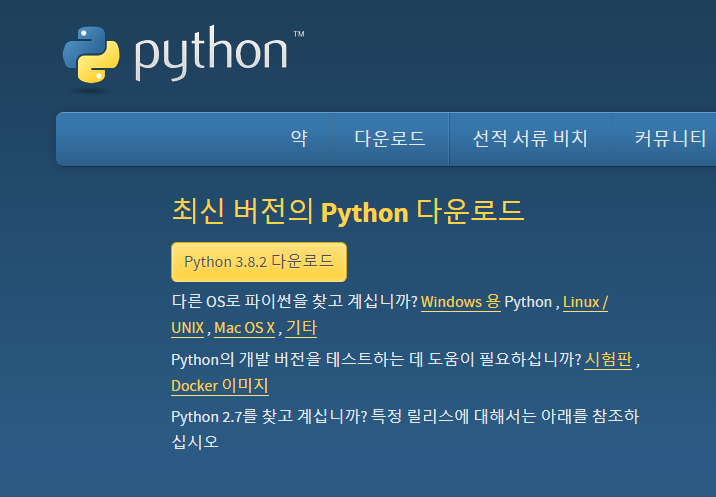먼저 python홈페이지로 가서 최신버전의 3.8.2 를 다운을 받는다.