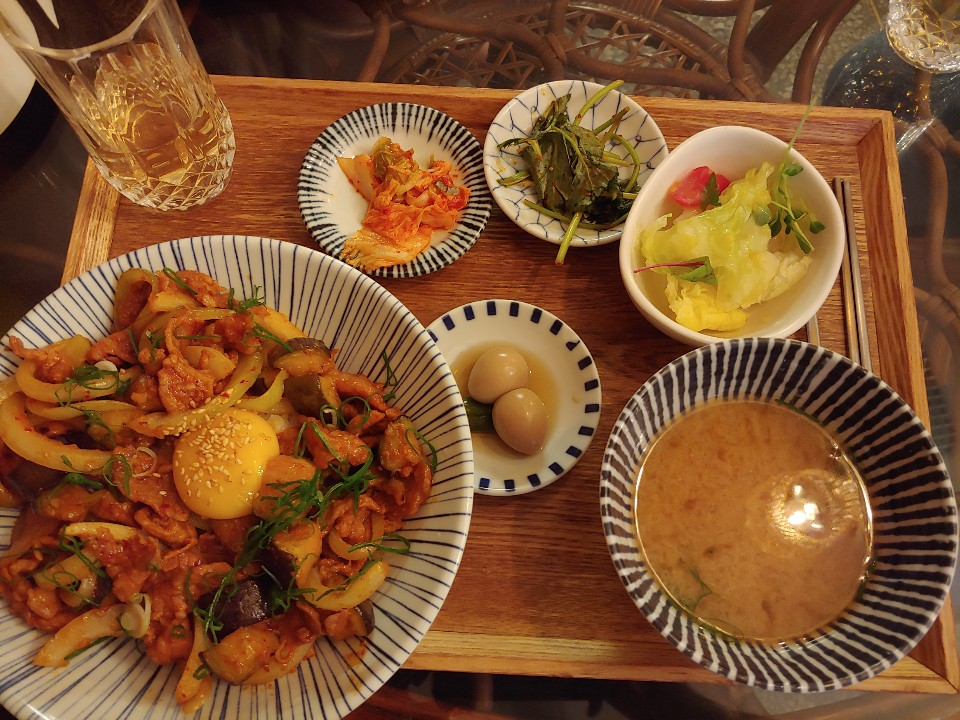 식사는 나무받침대에 반찬과 밥과 함께 나온다.