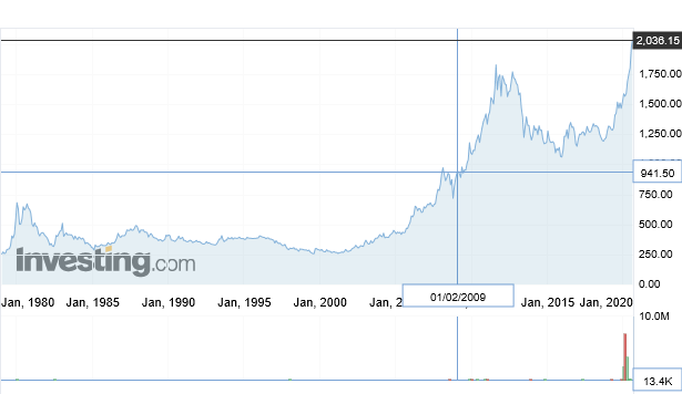 2009년 2월의 금값은 이전 최고치에 근접한 941달러였다.
