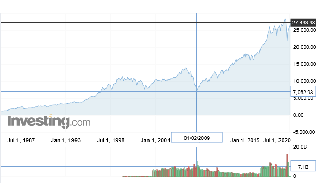 다우 및 나스닥 지수를 살펴보니 2009년 2월에 저점을 기록하였다.