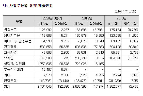 아래 사업부문별 매출 및 영업이익현황을 보면