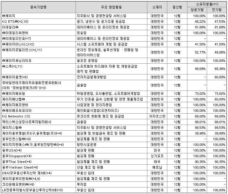 KG에너켐/KG ETS/KG동부제철 /KG이니시스+KG모빌리언스의 매출비중이 나와있다.