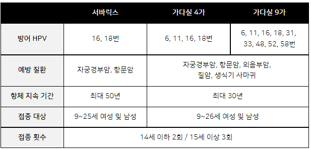 HPV 서바릭스 vs 가다실 4가 9가