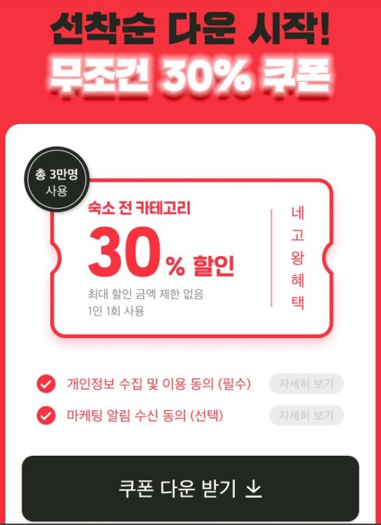 여기어때와 네고왕이 손잡고 숙소 전 카테고리 30%할인을 네고했다.