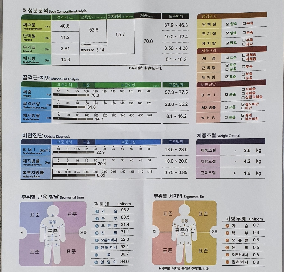 여기서 인바디를 통해 우리가 봐야할 수치는 체지방률 및 근육량이다.