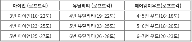 표를 보면 5번 우드와 3번 유틸리티와 3번아이언의 비거리가 같고, 4,5번 유틸리티와 4,5번 아이언과 비거리가 같다