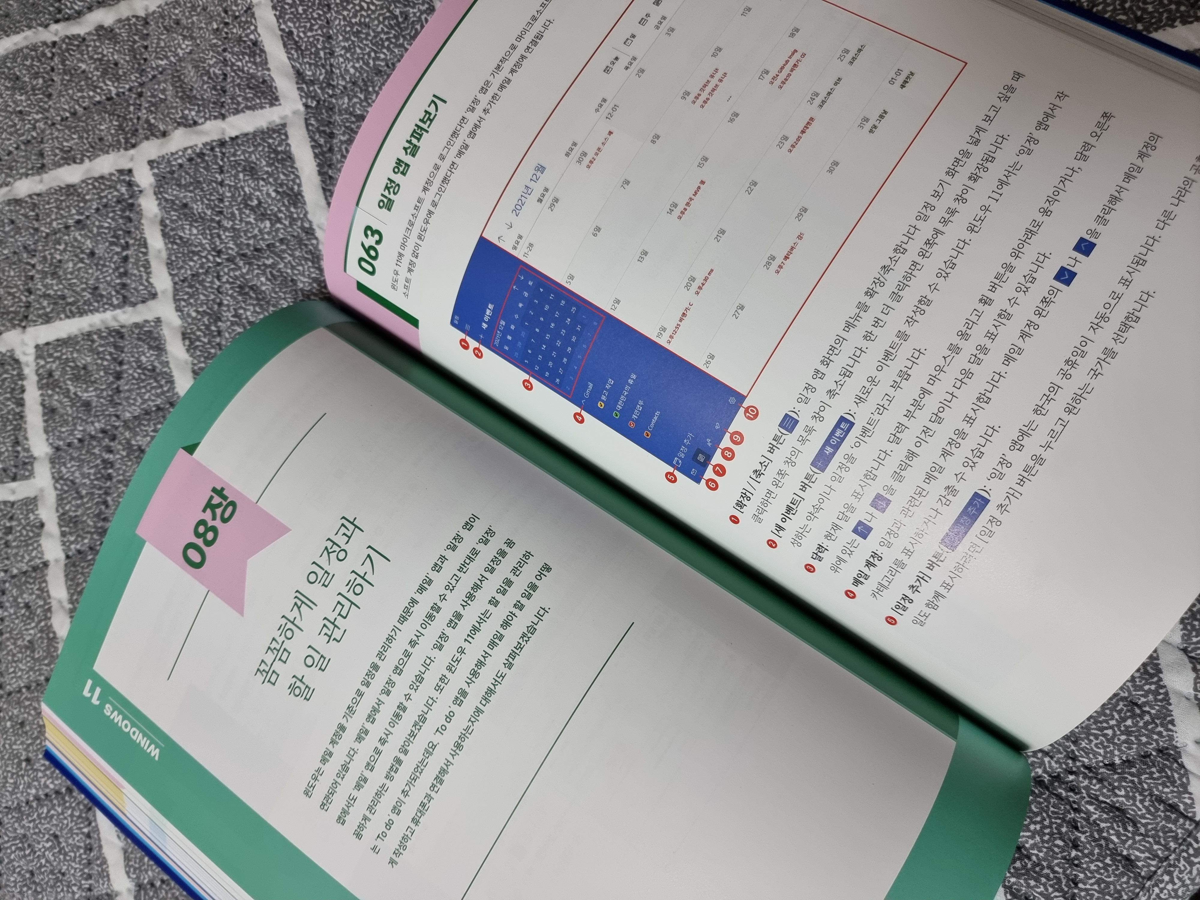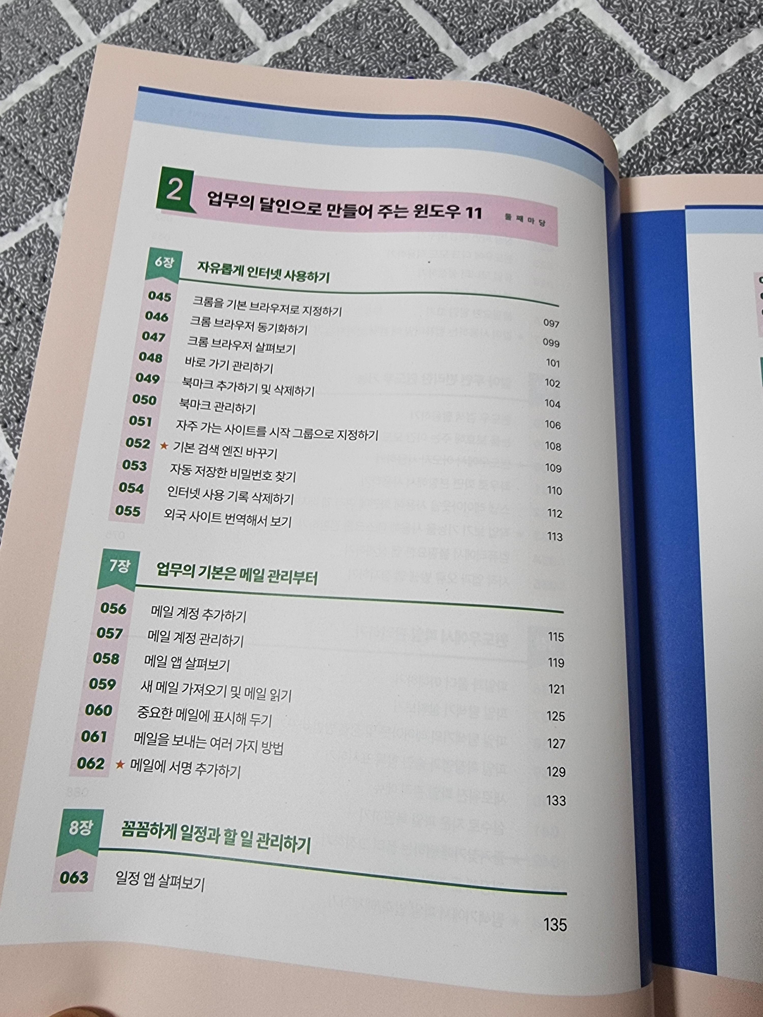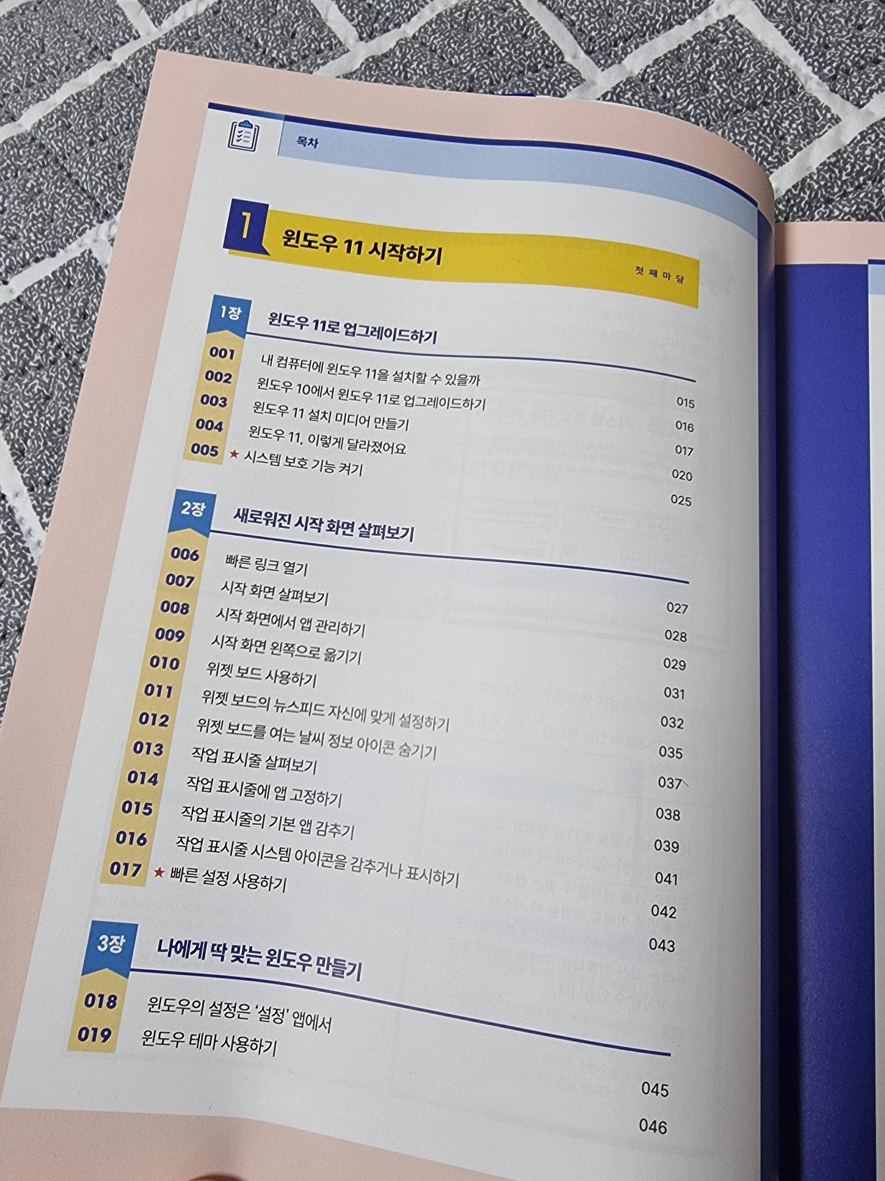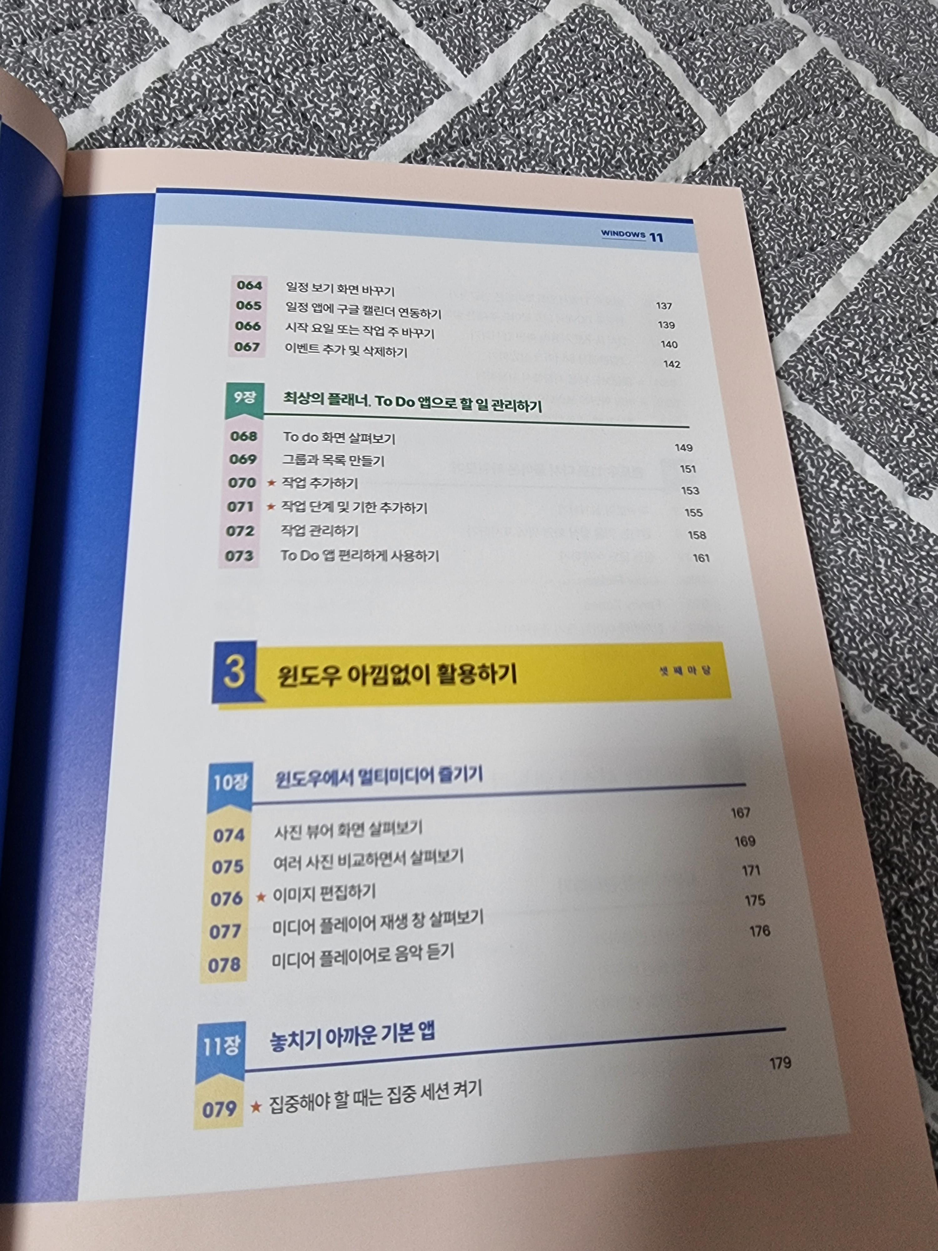 목차를 보면 윈도우를 시작하는 부분부터 편리한 윈도우 사용법 및 자신에게 맞는 윈도우세팅은 물론, 업무에 필요한 인터넷 사용법, 메일 관리, 일정 To Do 앱을 통한 할일 관리 등 실용적인 부분 및 사진 관련 멀티미디어 내용도 담겨있어서 알차게 구성되어있다. 다른 유튜버나 매체보다 가장 빠르고 효율적으로 윈도우 11을 배울 수 있는 입문서임을 알 수 있다.