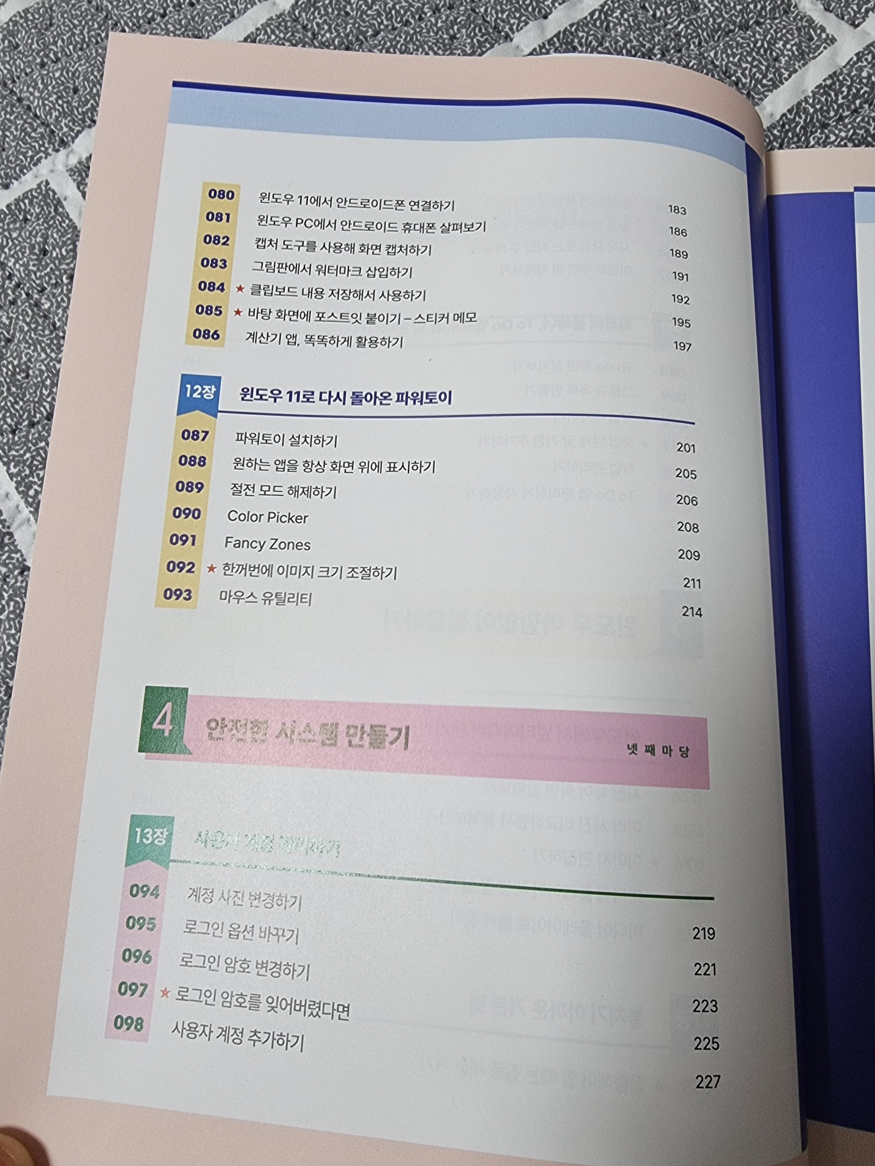 무엇보다 좋은게 사진들이 컬러플하게 잘 들어가 있어서 색감이 되게 이쁜 책인데, 가독성도 좋고 읽을 때 매우 알아듣기 쉽고 따라하기 좋았다. 몰라서 활용 못했던 다야안 기본 앱과 다시 돌아온 파워토이까지, 새로운 윈도우11에 대해서 알 수 있게 되어서 좋았다.