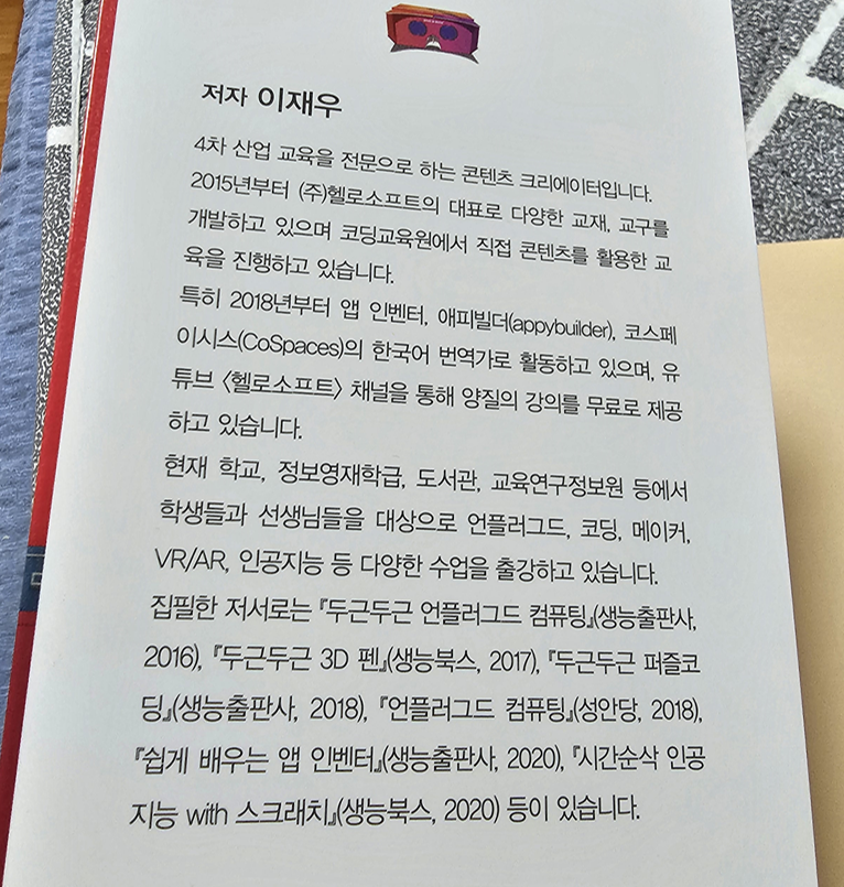 해당 책의 저자 이재우씨는 현재 학교 및 영재학급, 도서관 등에서 학생들과 선생님을 대상으로 코딩, 인공지능, VR/AR등 최신 기술에 대한 수업을 출강하고 있으며 최신 트랜드에 맞는 교육에 앞장서고 있다.