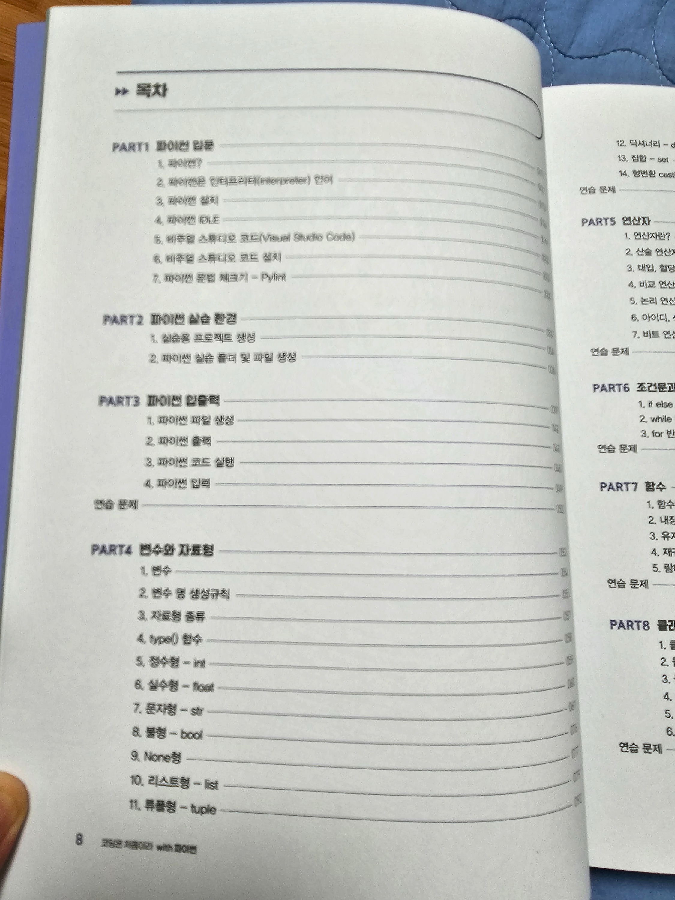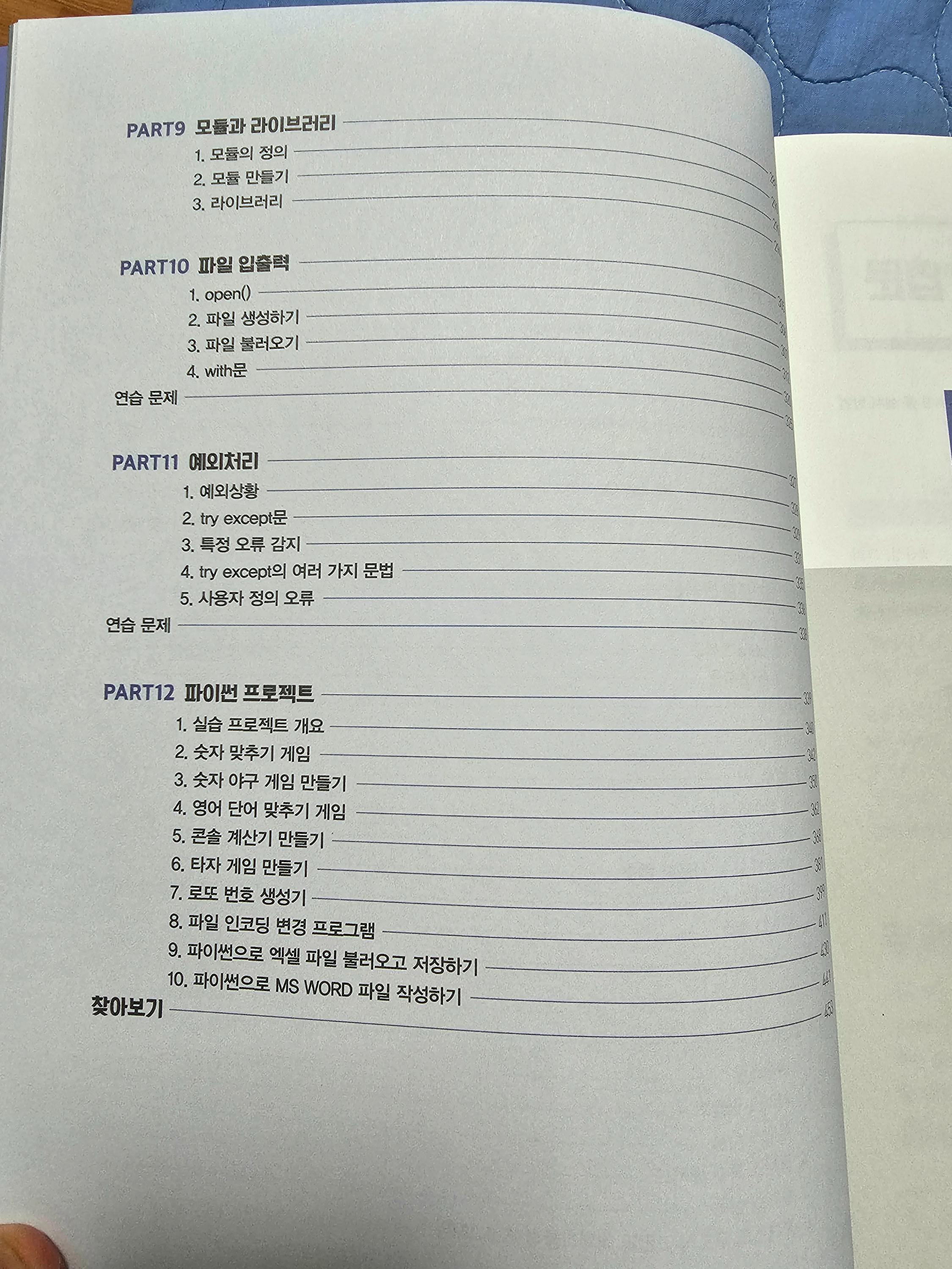 목차를 보면 파이썬 실습환경을 구성하기 위한 설치 환경 작업, 환경 파일 및 프로젝트 생성 등 부터 해서 마지막에 파이썬으로 실습해보는 다양한 게임 등의 프로젝트로 마무리를 한다.