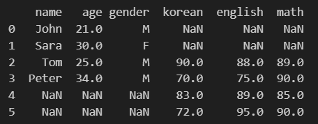 빈 칸은 NaN(=None =Null)으로 채워짐