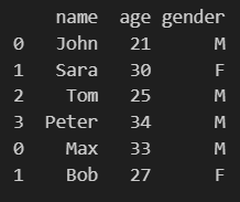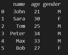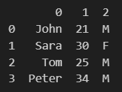 print(df)data = [['John', 21, 'M'],