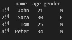 df = pd.DataFrame(data, columns=['name', 'age', 'gender'], index = ["1번", "2번", "3번", "4번"])