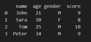 df = pd.DataFrame(data, columns=['name', 'age', 'gender'])