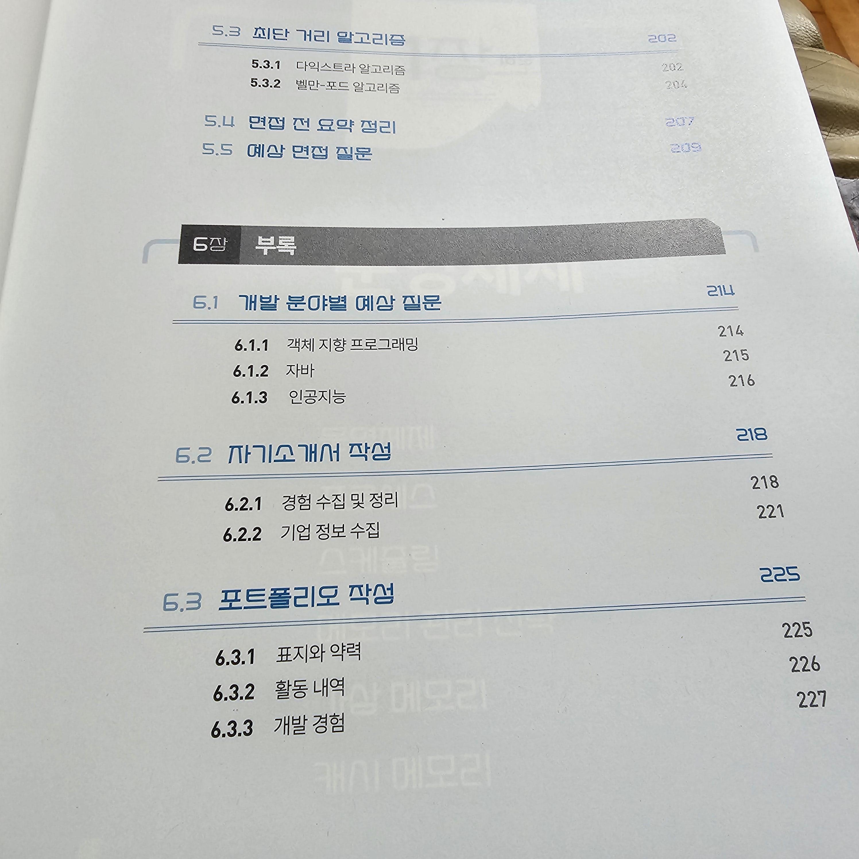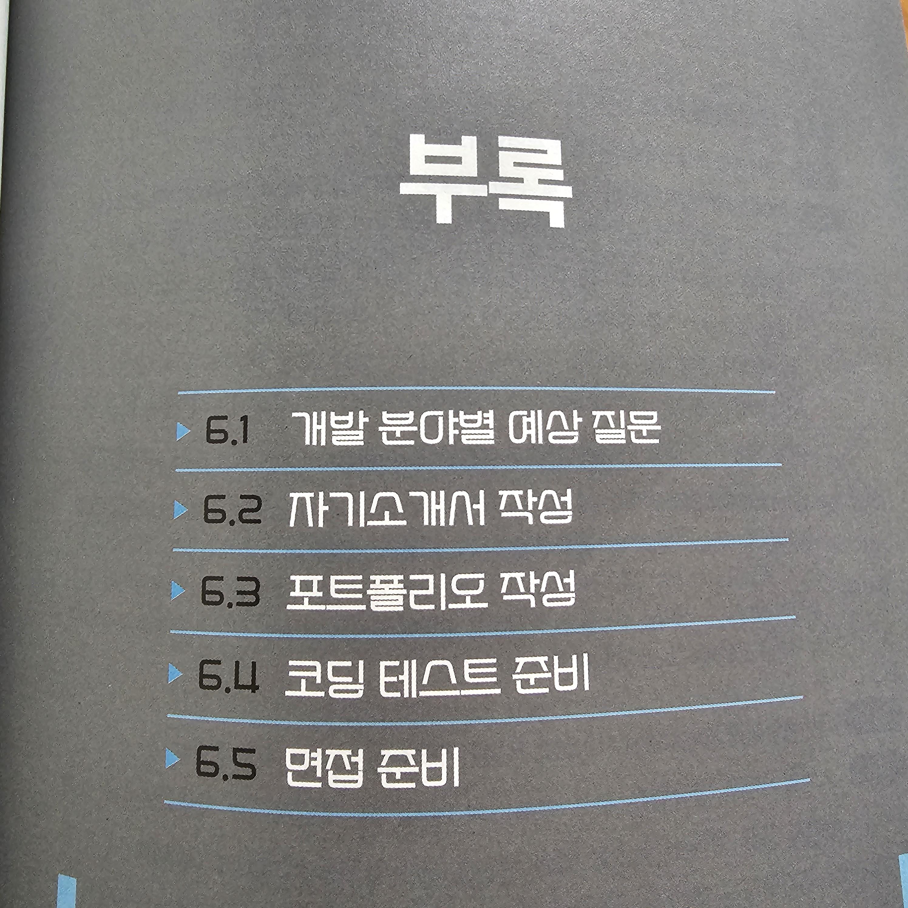 부록으로 개발 분야별 예상 질문, 자기소개서 작성방법 및 포트폴리오 작성, 백준과 같은 코딩 테스트 준비하는 사이트 소개 및 면접 준비까지 다양한 내용이 담겨 있고,
