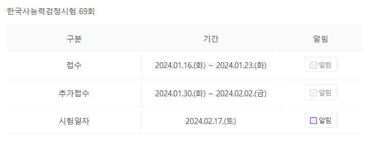 가장 최근 한국사 능력검정 시험 일정은 69회로 2/17토요일이다.