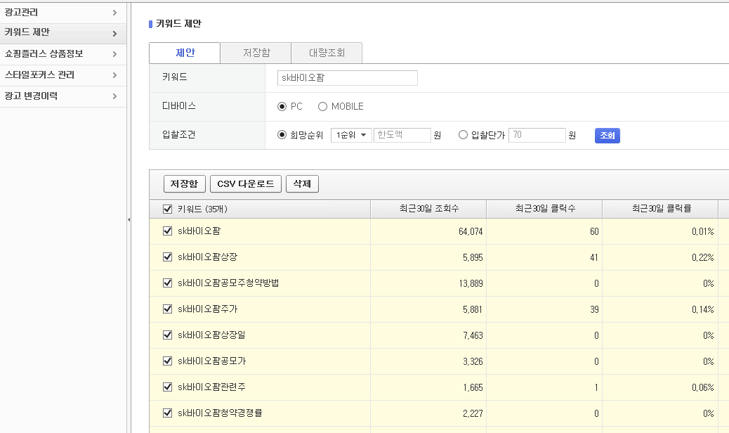 그럼 좌측에 키워드 제안이라는 부분이 있다.