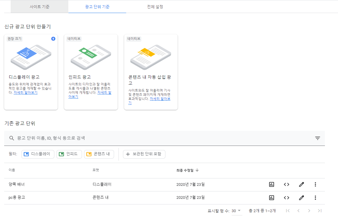 2. 광고 단위 기준으로 넘어가 디스플레이 광고를 설정해주자.