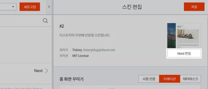 스킨편집 페이지의 오른쪽에 있는 html 편집 메뉴 클릭