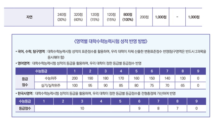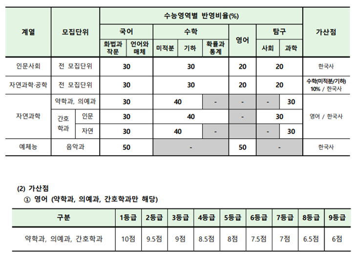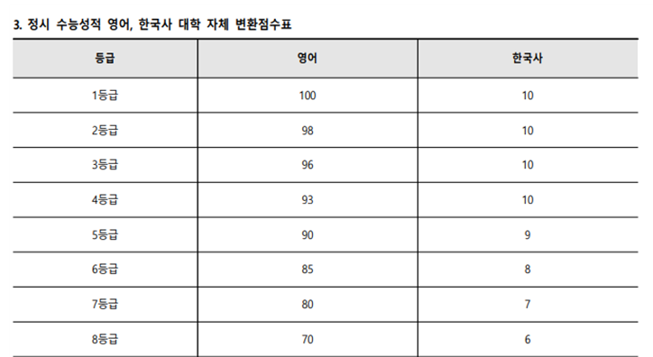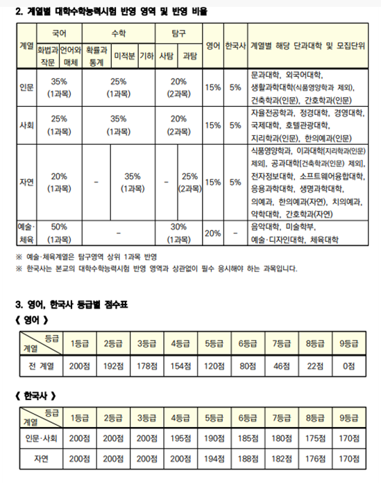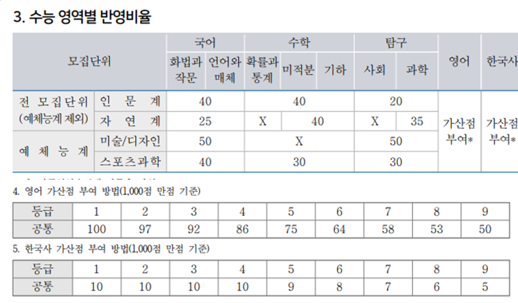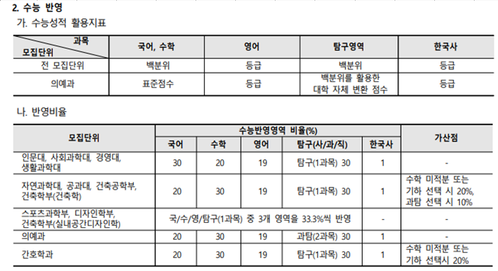 정시의 경우 각 학교마다 수능 반영 영역 및 점수가 다르기 때문에 본인들에게 유리한 점수를 가지고 가는 것이 중요하다.