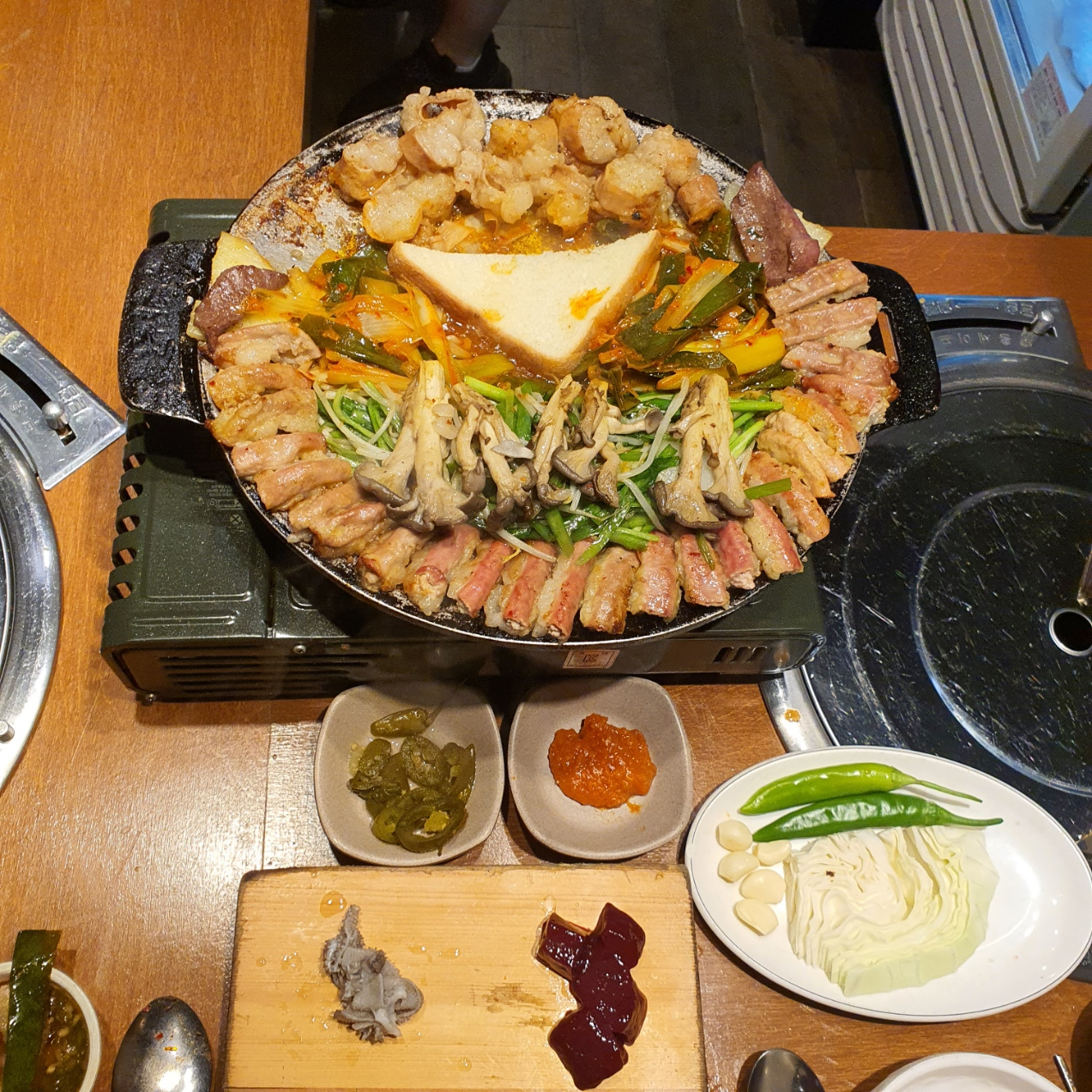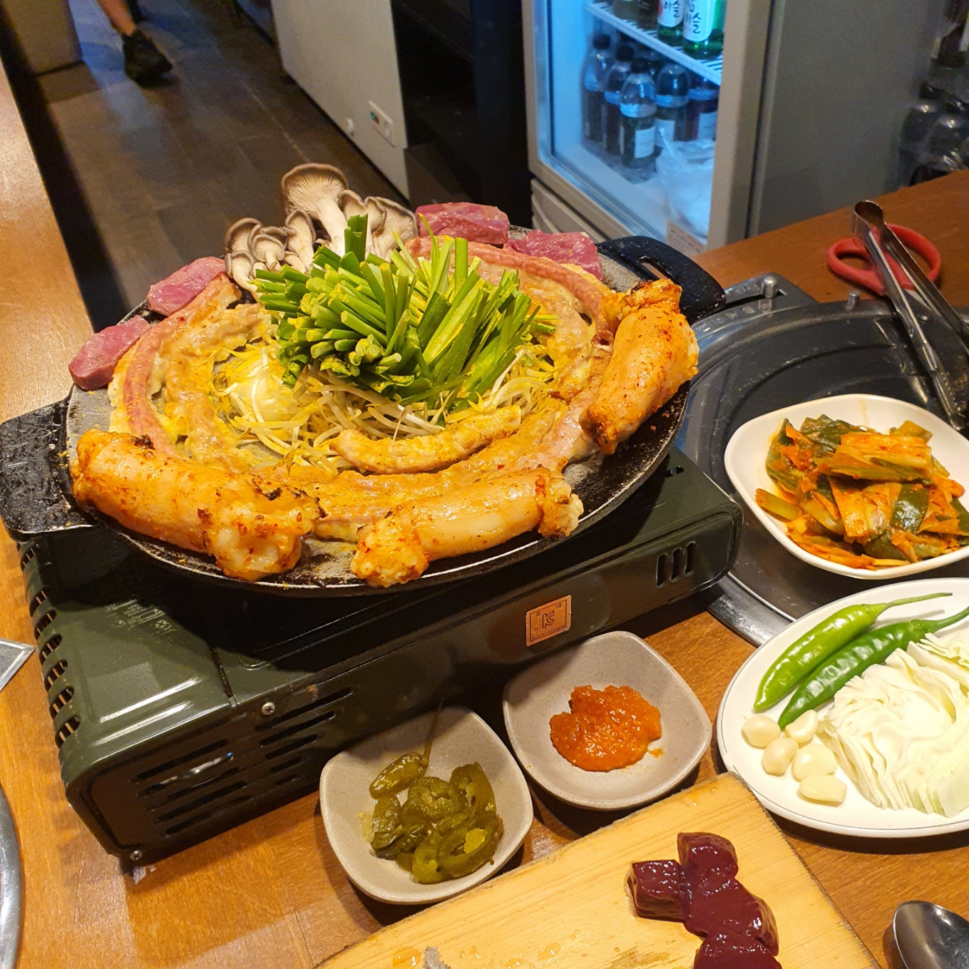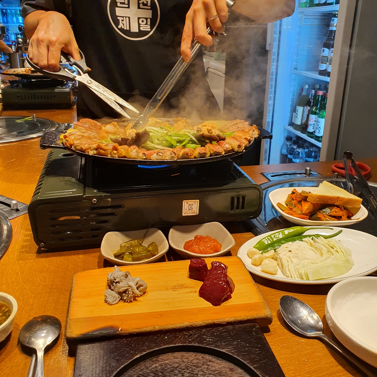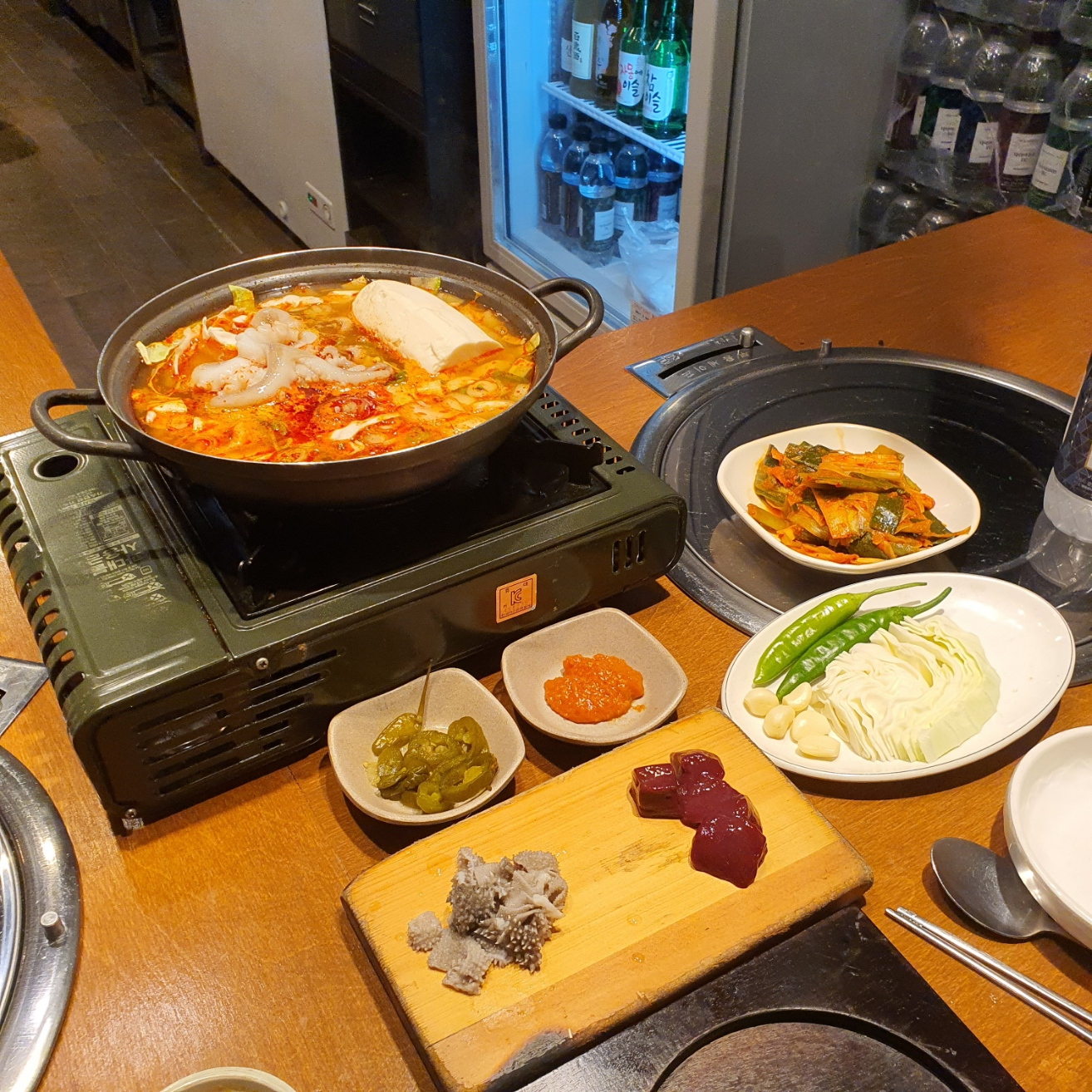 먼저 낙지 한마리 들어있는 순두부 끓여주고, 곱창이랑 막창이 일찍 요리되어 오면, 순두부는 안에서 끓여서 가져다 주신다.