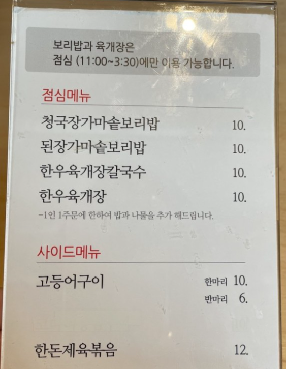 점심 메뉴는 다 1만원에 보리밥 또는 육개장을 팔고 있고, 전체 메뉴판은 아래와 같다.